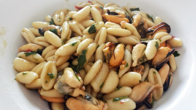 In una padella mettete l’aglio e il prezzemolo tritati, il peperoncino intero o tritato, l’olio e l’acqua filtrata delle cozze. Mettete sul fuoco e lasciate cuocere una decina di minuti. Vedrete che olio e acqua avranno raggiunto lo stesso volume. A questo punto aggiungete le cozze e lasciate cuocere per un’altra decina di minuti, poi spegnete.