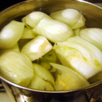 Tagliate i finocchi in quattro parti. Lavateli e lessateli.(1) Scolateli e fateli raffreddare prima di tagliarli.(2) Tagliateli a fattine sottili a conditeli con olio, sale e aceto