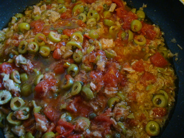 Spaghetti con sugo di olive, tonno e capperi